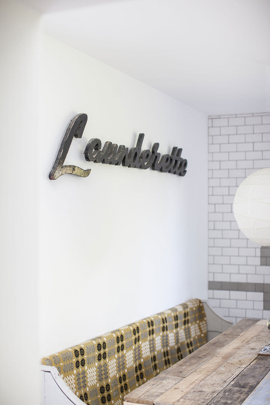 Op de vloer is er gekozen voor een rauwe en on afgewerkte betonvloer, die de keuken een stoere en industriële uitstraling geeft. Dit hebben ze gecombineerd met een grote strak gestuukte witte muur en muren die volledig tot aan het plafond betegeld zijn. De witte metrotegels zorgen voor een speelse restaurant uitstraling, vooral omdat de letter vier is betegeld met grijze varianten van de metrotegels.
