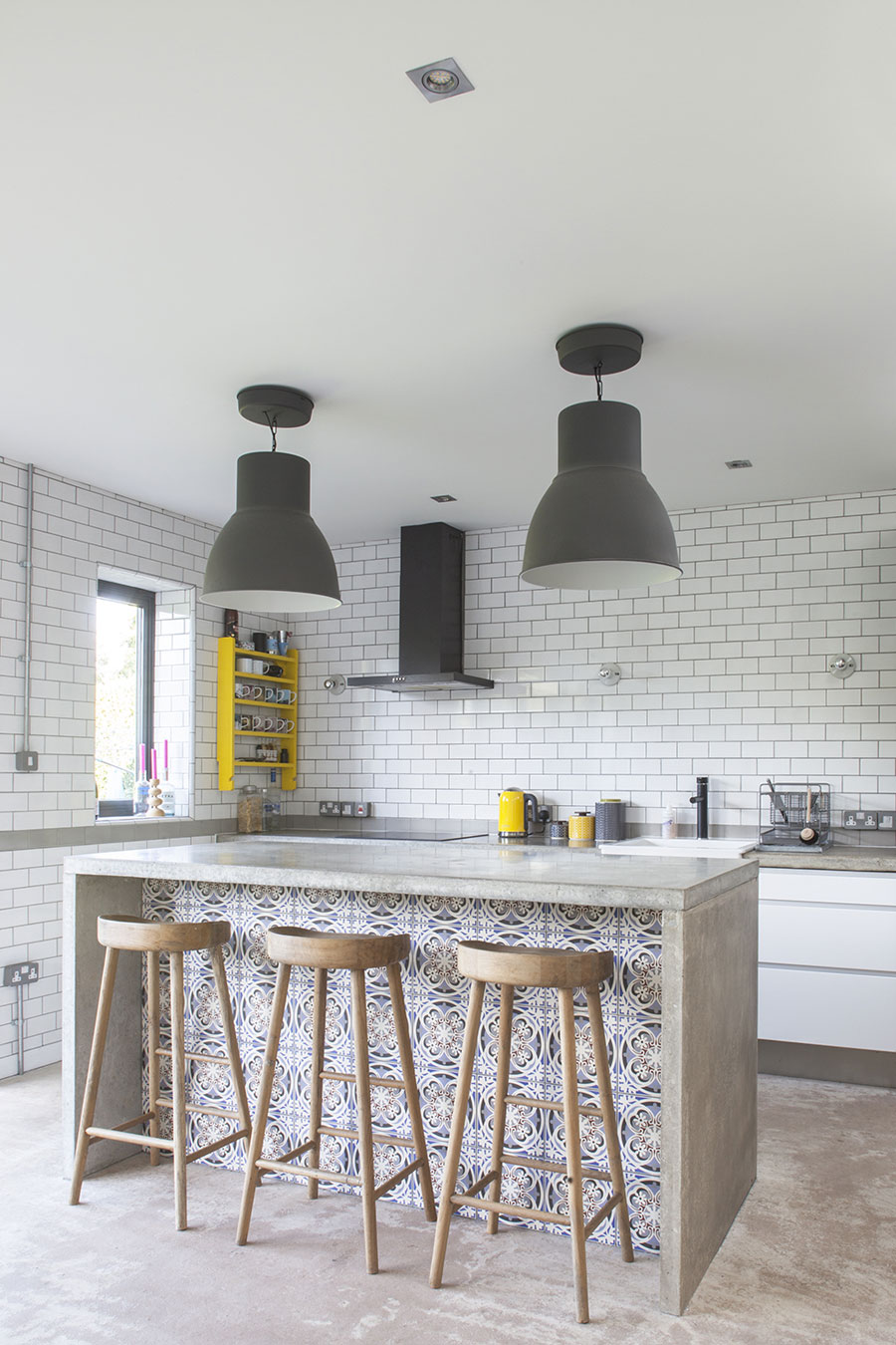 Naast de witte keukenkasten tegen de muur, vind je er ook een groot keukeneiland. Het keukeneiland bestaat uit een dik betonnen frame, waarvan de buitenkant betegeld is met hele leuke wit blauwe patroontegels. Hierdoor heeft de keuken ook een beetje een mediterraanse sfeer gekregen. De drie vintage houten barkrukken daar tegenaan passen perfect bij de stijl, net als de twee grote zwarte industriële hanglampen boven het eiland.