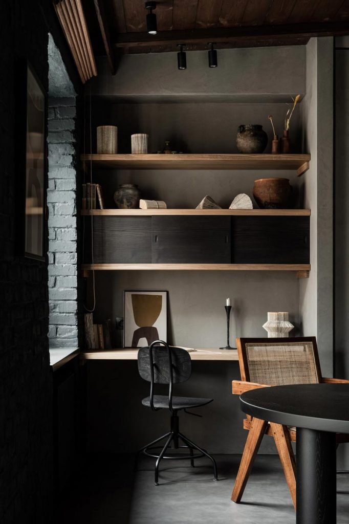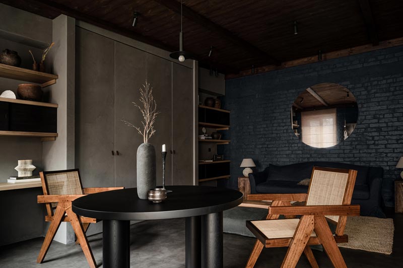 Fradina balanceerde donkere kleuren met natuurlijke texturen om te voorkomen dat de multifunctionele ruimte er overgewicht uitzag. Zo werden de bakstenen donkerblauw geverfd, gecombineerd met donkerbruine grenenhouten plafonds. Hierdoor heeft het interieur een moody sfeer ontstaan, terwijl met de natuurlijke materialen en texturen voor extra sfeer warmte zorgen. Dit omvat de stoere lage houten salontafel in de zithoek, die op maat werd gemaakt door de lokale meubelmaker Staritska Maysternya, de rotan loungestoelen, de grote open wandkast bestaande uit brede houten planken, de bamboe rolgordijnen, het sisaltapijt en het houten plafond.