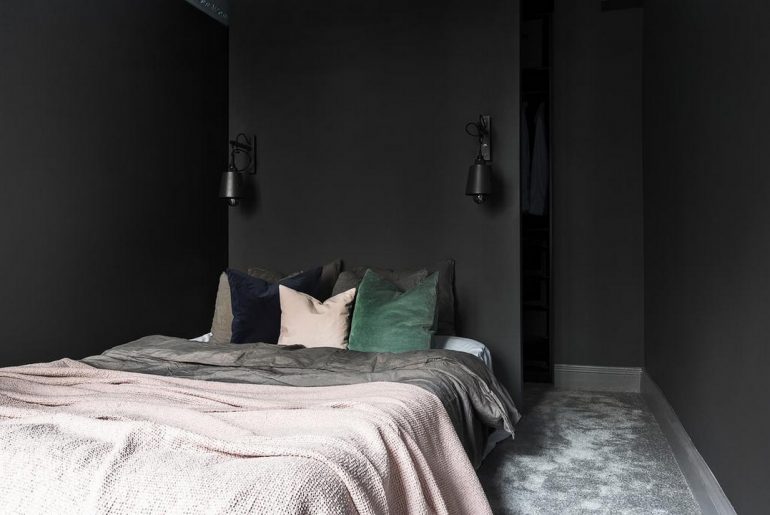 Het is de slaapkamer van een Scandinavisch appartement, maar in tegenstelling tot veel witte Scandinavische interieurs, hebben ze dit appartement juist een beetje donker ingericht. Zoals je hier in deze slaapkamer kunt zien, hebben ze hier gekozen voor zwarte muren. De klassieke kozijnen, plinten en radiatoren zijn donkergrijs geschilderd, terwijl het plafond een mooie Denim Drift grijs blauwe kleur heeft gekregen. Denim Drift is door Flexa uitgeroepen als kleur van het jaar, en hier hebben ze de mooie kleur een plekje gegeven door het plafond te schilderen. Het resultaat is super mooi en vooral bijzonder. Wat ook opvallend is, is de tapijt vloer. Een grijze tapijt vloer, die in ieder geval voor lekkere warme voeten zorgt.