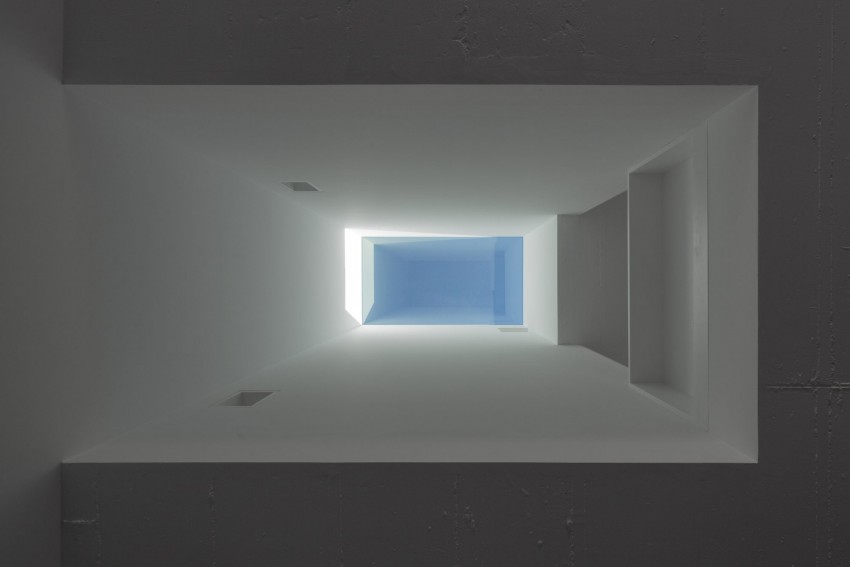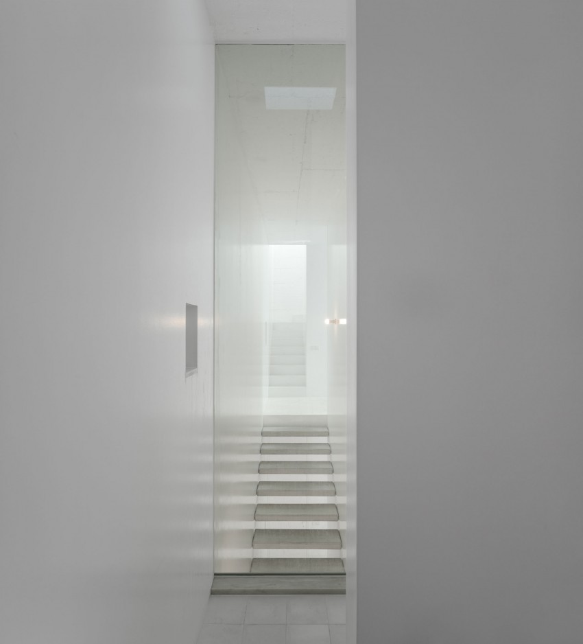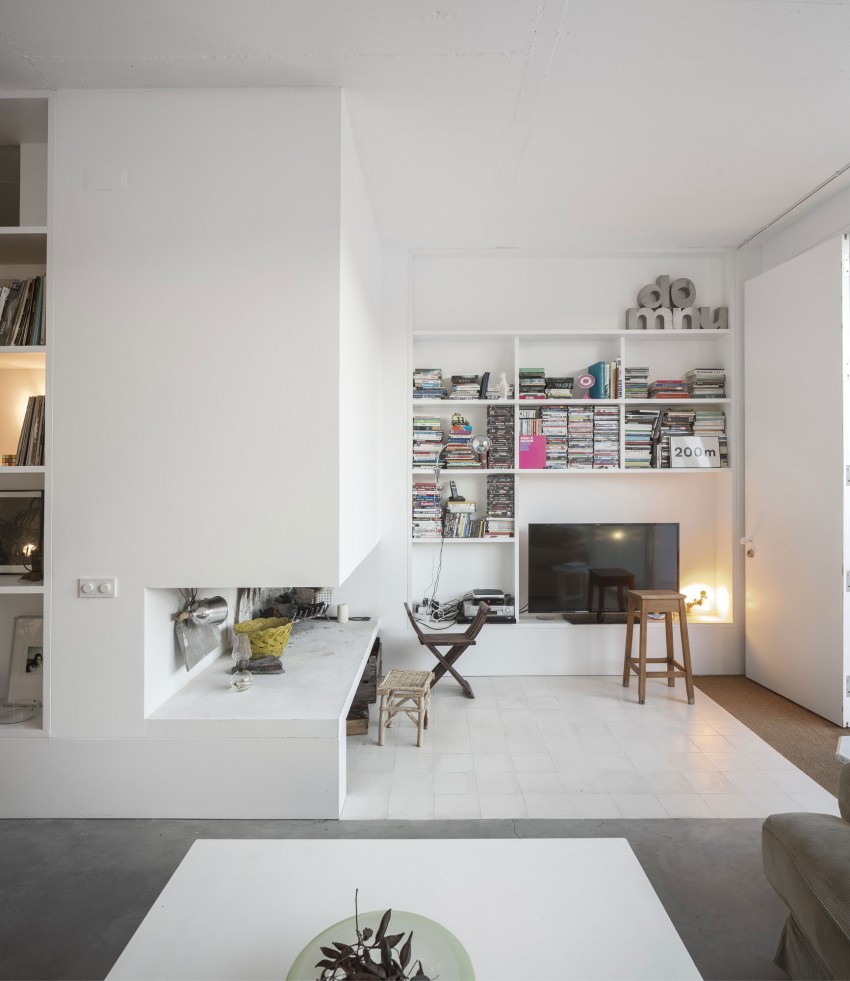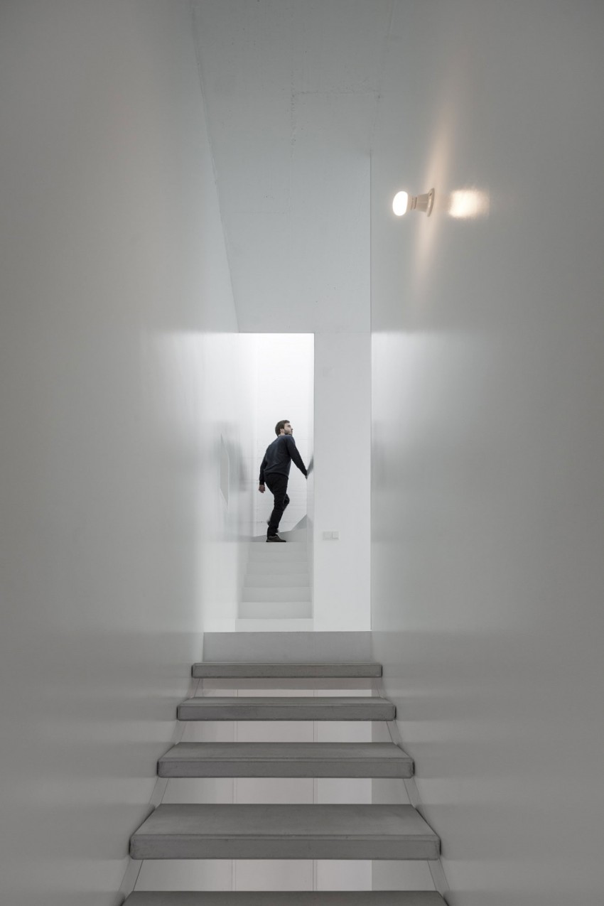 Binnen is de sfeer totaal anders dan je van de buitenkant zou verwachten. Strakke witte muren en een stoere betonvloer vormen de basis van het interieur. Alles is minimalistisch, rauw en met opzet onafgewerkt gehouden – precies zoals de architecten het bedoeld hebben. De kasten en opbergruimtes zijn allemaal op maat gemaakt en komen terug in elke ruimte: van de keuken tot de badkamer. In de sociale ruimtes zijn ze zelfs open, zonder deuren, om het nonchalante karakter van de woning te benadrukken.