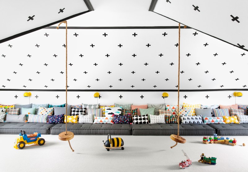 Een lichte zachte tapijtvloer is hier gecombineerd met strakke witte wanden. De houten latten aan de randen van de muren en het plafond zijn zwart geschilderd. Het effect is dat de speelkamer er nog ruimer uitziet. Om de kamer ook een speelse sfeer te geven, zijn de witte muren ook gedecoreerd met zwarte kruisjes. Dit is heel eenvoudig te realiseren met zwarte tape. Het voordeel hiervan ten op zichte van bijvoorbeeld behang, is dat je het tape met hetzelfde gemak weer kunt verwijderen.