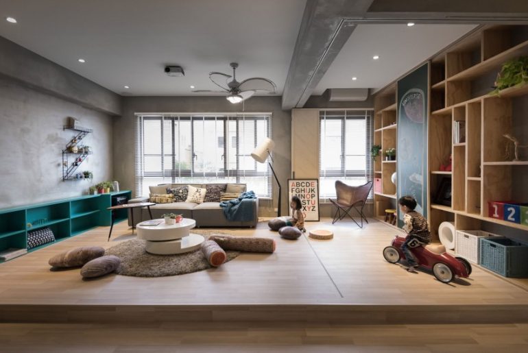 Heb je kleine kinderen in huis? Dan is een speelhoek natuurlijk altijd een goed idee. Kinderen spelen immers liever allemaal in de woonkamer in plaats van hun eigen kamer. Het voordeel is bovendien dat je ze in de gaten kunt houden. De uitdaging is echter wel om ervoor te zorgen dat de speelhoek je woonkamer overneemt. De ontwerpers van Hao Interieur design kwamen voor de inrichting van een modern appartement uit Taiwan op het idee om vouwdeuren te plaatsen in de woonkamer, waar de speelhoek volledig afgesloten kan worden. Ideaal, toch?!